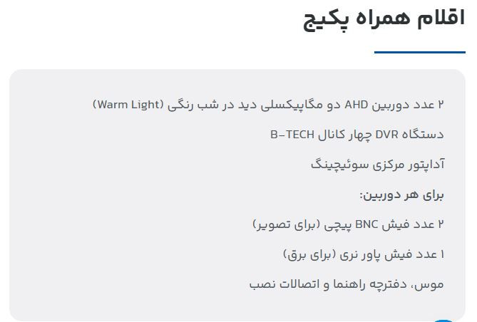 پکیج چهار دوربینهی دو مگاپیکسلی B-TECH انتخابی مطمئن و اقتصادی برای کسانی است که به دنبال کیفیت تصویر واقعی، دید در شب رنگی و گارانتی معتبر هستند.